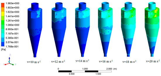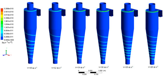 Erosion of cyclone surfaces due to the collision of wheat seeds is studied in this section. The erosion of the wheat seeds is studied in six inlet velocities and three mass flow rates. The contours of the erosion rate are shown in Figure 13 and Figure 14. The inlet velocity for the mass flow rate study was assumed 16 m⋅s−1, and the cyclone wall was an iron sheet. The wheat seeds at the inlet of the cyclone have a uniform concentration.