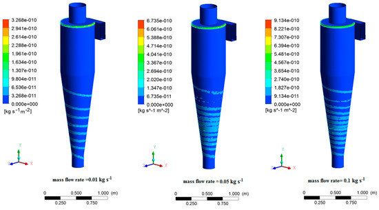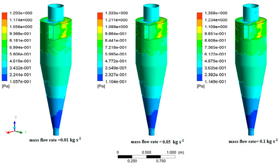 In addition, it can be seen that increasing the mass flow rate has a direct effect on the shear of the wall and reached the maximum value of 1.293 Pa for the mass flow rate of 0.01 kg⋅s−1 and 1.358 Pa for the mass flow rate of 0.1 kg⋅s−1 (Figure 18). The maximum wall shear was created in the inlet section of the cyclone in which the high momentum of flow could be the main reason for this high value. Regarding the swirling motion of flow in the body and conical section, the minimum wall shear was observed in the bottom part of the conical section.