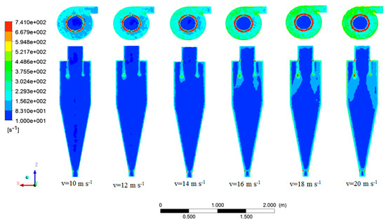 The strain rate domain increases by increasing the inlet velocity and extends to the adjacent sections with a gradual process (Figure 15). The main impact of increasing the inlet velocity is on the bottom edge of the vortex finder. This event indicates a significant rise in its range.