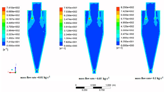 In addition, increasing the mass flow rate, raise the strain rate within the cyclone. It indicates more strain changes at a given time. This increase probably is due to the cyclone operating at a higher mass flow rate and higher particle collision. The trend is illustrated in Figure 16. Despite the low values of the strain rate for the cyclone body, in areas with maximum values, it can have destructive effects in the long term.