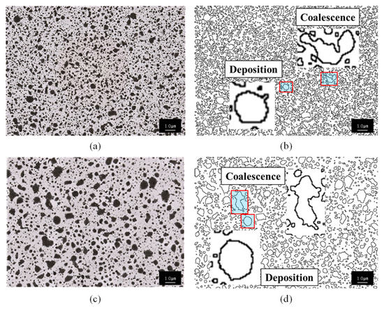 The nozzle diameter is the first factor in determining the effect of the spray process on the morphology of the printing surface. Nozzle size influences the formation of particle size critically. The particle size affects how the CNT/CNF complex in the fiber form of conductive ink is distributed on the substrate. Various spray nozzle designs are used, such as full cone, hollow cone, and flat fan. A previous study reported that droplets are commonly the largest size in a full cone and the smallest in a hollow cone [23]. In this study, a hollow cone nozzle was used for the experiment. Two nozzle diameters, 0.4 Ø and 0.7 Ø, compatible with spray machines, were used to make samples at a distance of 14 cm for one second. Figure 3 shows the deposition and coalescence of droplets according to nozzle diameter, and the number of droplets was calculated by simplifying the image. In Figure 3a,c, the dark areas are ink, and the light areas are substrate. Figure 3b,d are the same as Figure 3a,c, respectively, but also show only the outline of deposited ink, which was converted by Image J. The criterion for selecting ‘deposition’ is not size but whether or not the droplets overlap; therefore, Figure 3b,d show a more apparent difference between the deposition and the coalescence.