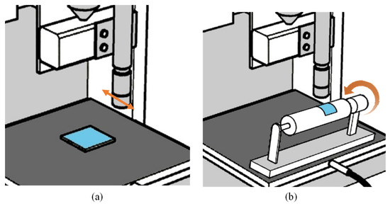 We used a spray coater with an air dispenser type (multi spray coater, Hantech, Daejeon, Korea) for the spraying process with a hollow cone nozzle. This machine is a customized model with a moving substrate added. The structure is presented in Figure 2. The machine can adjust the spray to make samples. The machine sprays the liquid using air pressure by adjusting 5 parameters such as nozzle pressure, moving speed, and several spray counts. During the spraying process, the spray nozzle is fixed at an angle of 10 degrees. After spraying, the samples were allowed to dry at room temperature for 24 h before analysis. The polyethylene terephthalate (PET) film of 10 × 10 cm was used as a substrate. Finally, spray-print samples were obtained according to a parameter change covering the entire surface of the PET substrate.
