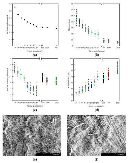 Total properties by controlling spray speed (a) surface roughness, (b) thickness, (c) surface resistance, (d) conductivity, and scanning electron microscope (SEM) images of sprayed film at speeds of (e) 200 mm/s and (f) 2000 mm/s by controlling spray speed.
