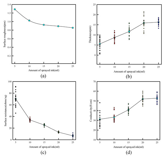 Total properties according to amount of sprayed ink: (a) surface roughness, (b) thickness, (c) surface resistance, and (d) conductivity.