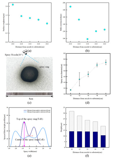 On the other hand, it is shown in Figure 7f that the ToR change in DNS of 18 cm in DNS of 10 cm is 40.43%, but the CoR change of the spray ring is only 2.46%. Interestingly, the central height of the spray ring, CoR, was almost constant independently of DNS. These results mean that a uniform surface can be obtained using CoR when manufacturing a large-area print.