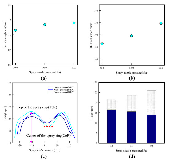 Effect of spray nozzle pressure in (a) surface roughness, (b) bulk resistance, (c) height profile of spray-ring, and (d) a comparison of ToR and CoR.