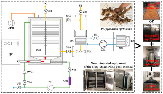 As a typical representation of the traditional products of the Nine-Steam-Nine-Bask method, Polygonatum cyrtonema can be used in the application research of the corresponding integrated equipment. The evaluation and analysis of the processing performance of the integrated equipment and the quality of the processed products will have important guiding significance for the further optimization of the integrated equipment and the development and application of the processing technology of characteristic Chinese medicinal materials. The comprehensive evaluation indicators of products processed by the integrated equipment mainly include color, odor, taste, recovery rate, polysaccharide content, processing time, processing energy consumption, etc., of which color, odor and taste are sensory qualities. The recovery rate, polysaccharide content, processing time, and processing energy consumption of the products processed by the integrated equipment are judged and scored through their experimental results. In the adopted scoring standard, the highest score is 95 points, the lowest score is 60 points, the scores are scored at a five-point interval, and the same score is scored in the same situation. Then, the average total score of each evaluation index is calculated and ranked accordingly, and finally, the best new process among all processes is determined.