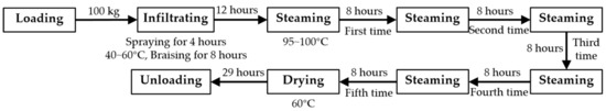 Figure 13. In the process of medicine infiltration, the total processing electric energy percentages of JGY1, XGY1, XGY2, XGY3, XGY4, XGY5, XGY6, and XGY7 were 0%, 5.24%, 4.08%, 4.42%, 5.71%, 3.72%, 6.89%, and 6.4%, respectively. JGY1 did not require electric energy but required labor, while the total processing electric energy percentage of XGY6 was the largest. It should be noted here that the infiltrating conditions of all new processes were the same, and the energy consumption fluctuated in the range of around 23.5–25 kW∙h, which is relatively normal. Due to the differences in the total processing electric energies, the total processing electric energy percentages of the infiltrating process of the new processes will be quite different. During the steaming process, the total processing electric energy percentages of JGY1, XGY1, XGY2, XGY3, XGY4, XGY5, XGY6, and XGY7 were 61.94%, 76.02%, 64.32%, 82.51%, 76.34%, 85.13%, 51.21%, and 47.77%, respectively. The total processing electric energy percentage of XGY7 was the smallest, while that of XGY5 was the largest. The total processing electric energy percentages of the steaming process of all new processes were in the range of around 47.77–85.13%, and the fluctuation range was large. This shows that the steaming process directly affects the overall energy consumption, which indicates that the steaming process is the most energy-consuming production step among all of the processing steps, and the future optimization of energy conservation and emission reduction should focus on this step. All braising processes of JGY1, XGY4, and XGY5 involve a natural cooling process and no energy consumption, so their energy consumption is zero. However, other new processes have no braising process, so their energy consumption is also zero. Therefore, the braising process will not affect the energy consumption. In the drying process, the total processing electric energy percentages of JGY1, XGY1, XGY2, XGY3, XGY4, XGY5, XGY6, and XGY7 were 38.06%, 18.74%, 31.61%, 13.06%, 17.95%, 11.15%, 41.9%, and 45.83%, respectively. The total processing electric energy percentage of XGY5 was the smallest, while that of XGY7 was the largest. The total processing electric energy percentages of the drying process of all new processes were in the range of around 11.15–45.83%, and the fluctuation range was also large. This shows that the drying process will also affect the overall energy consumption. The drying process is the second most energy-consuming link after the steaming process, and the future optimization of energy conservation and emission reduction should also be focused on this link.