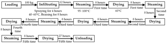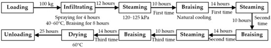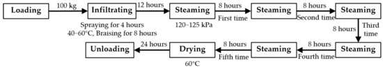 In the above formula, TRY, TZZ, TMZ, and THG represent the times of infiltration, steaming, braising, and drying, respectively, in hours. ∑T is the total time of the product processing in hours. PTRY, PTZZ, PTMZ, and PTHG represent the total processing time percentages of the product for infiltrating, steaming, braising, and drying under different processing conditions, respectively, in %. ∑TXGY is the total processing time of each new process in hours. ∑TJGY1 is the total processing time of JGY1 in hours. PTJS is the percentage of time saved compared with JGY1 in %. RY, ZZ, MZ, HG, and JS represent infiltrating, steaming, braising, drying, and time saving, respectively.