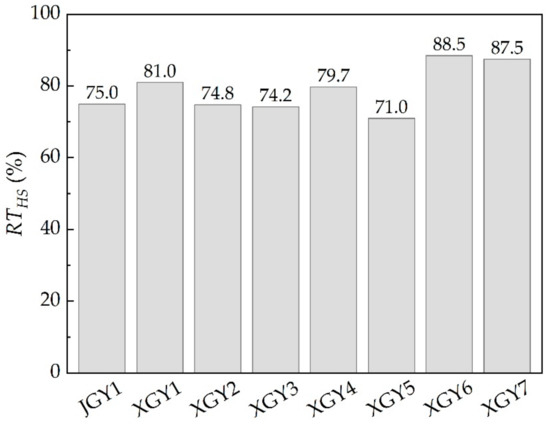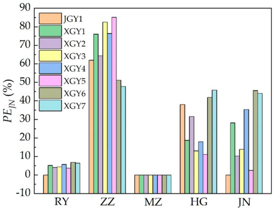 Figure 10, and the order of size was XGY6 > XGY7 > XGY1 > XGY4 > JGY1 > XGY2 > XGY3 > XGY5. The results show that the different processing conditions have a great influence on the product recovery rate. If you only look at the product recovery rate, the products processed by XGY6 are the most economical, and XGY5 is the worst. Compared with XGY1, the product recovery rate of XGY2 is lower, mainly due to the greater loss of