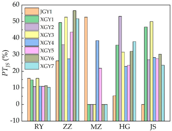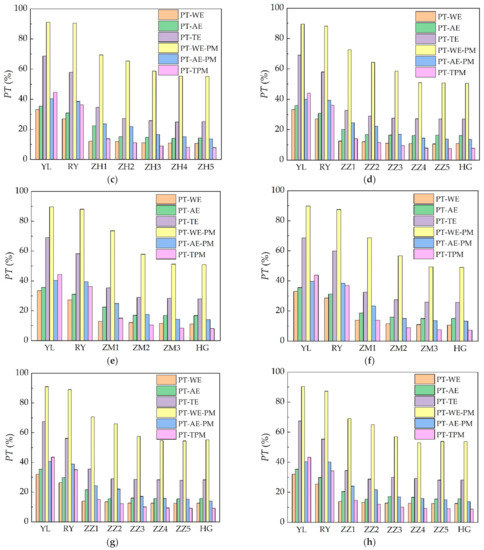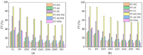 Figure 11b, which are completely similar to those of JGY1, showing a trend of decreasing at first and then tending to balance. PT-WE finally decreased from 32.14% of raw material to 12.24% of dried. PT-AE decreased from 35.48% of raw material to 16.07% of dried. PT-TE decreased from 67.62% of raw material to 28.32% of dried. PT-WE-PM decreased from 90.83% of raw material to 55.69% of dried. PT-AE-PM decreased from 38.71% of raw material to 13.84% of dried. PT-TPM finally decreased from 42.93% of raw material to 9.04% of dried. PT-WE-PM was also much larger than PT-AE-PM.