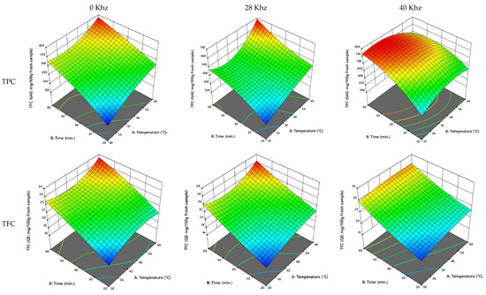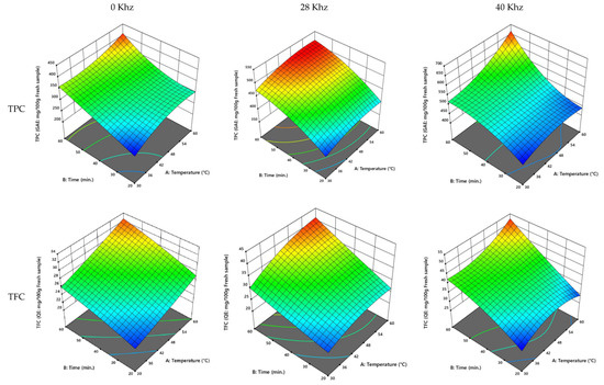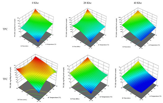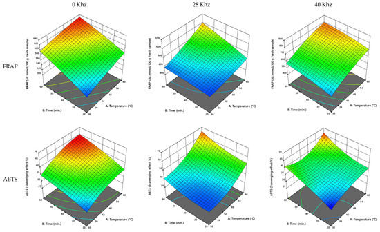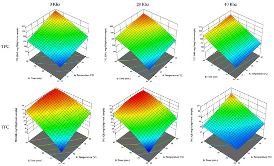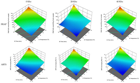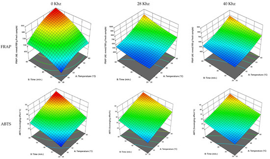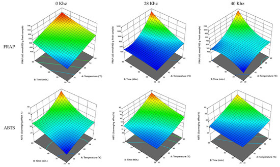 Figure 1 represents the interactions between temperature and time of the extraction process with, and without, application of two ultrasonic frequencies (28 and 40 Khz) for the Agwa cultivar to obtain the response variables (TPC, TFC, FRAP, and ABTS). Rising temperatures from 30 to 60 °C through 20 to 60 min extraction time enhanced the TPC, TFC, FRAP, and ABTS values. The increase in temperature and time (60 °C and 60 min) increased TPC by 1.9 folds from conventional water extraction (Table 1) without ultrasonic application. However, the application of 28 Khz and 40 Khz frequencies of ultrasonic increased the TPC extraction by 3.2 and 4 folds from conventional water extraction. Similarly, increase in temperature and time increased TFC by 1.5, 2.25, and 3.9 folds when 0, 28, and 40 kHz Ultrasonic frequencies were used. FRAP activity increased by 1.3, 2.7, and 2.3 folds for antioxidant capabilities when 0, 28, and 40 Khz ultrasonic frequencies were used. The ABTS scavenging activity showed a similar pattern to FRAP, and increased by 2.2, 3.3, and 2.2 folds when 0, 28, and 40 Khz Ultrasonic frequencies were used. It is worth noticing that the antioxidant power of the extracts increased when applying just temperature and time maxima (a nearly two-fold increase); however, these folds increased more with the application of the 28 kHz frequency of Ultrasonic. Yet the application of the 40 kHz did not significantly increase the antioxidant power (i.e., FRAP and ABTS values were reduced at the higher frequency), although it significantly increased the TPC and TFC.