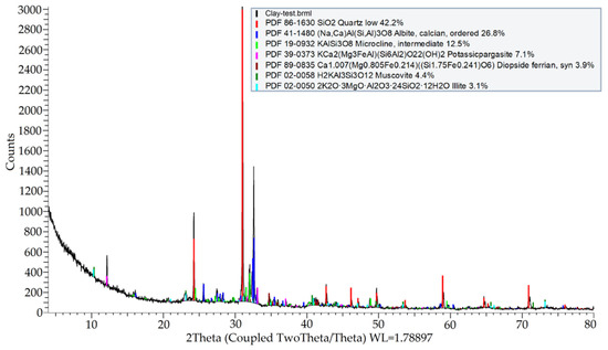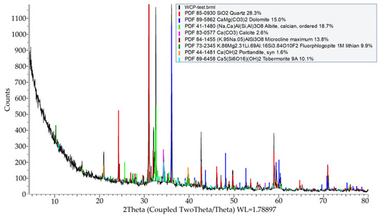 The primary concrete of concrete CDW originates from high-strength railway sleepers. A recycled concrete fraction 22.4/63 mm was delivered to the laboratory by the recycling company. First crushing and milling were executed in Los Angeles apparatus at 2000 rotations. Final milling was performed in micro-Deval apparatus as per BDS EN 1097-1:2011 at 20,000 rotations [27]. The fraction 0/0.5 mm was used for clay stabilization. The mineral composition of the used WCP determined by XRD analysis described in Section 2.5.1. consists of 28% of quartz, 33% feldspars, 10% mica, 15% dolomite, calcium silicate hydrates such as tobermorite (10%), calcite (ca. 2.6%) and portlandite (1.6%)—Figure 4. The WCP grading analysis was performed according to BDS EN 933-1:2012 [25]. The grading curve was presented in Figure 2. The recycled WCP has a specific density, ρS, of 2.68 Mg/m3, determined according to BDS EN 1097-6:2022 [26].
