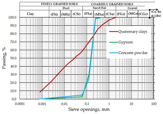 The particle size distribution of quaternary clays was determined by EN ISO 17892-4:2016 [23] and is illustrated in Figure 2.