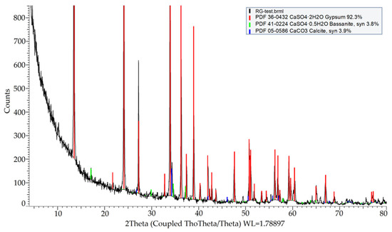 Gypsum used for clay stabilization was obtained by mechanical recycling only of plasterboards type “A”, manufactured by KNAUF Bulgaria in compliance with BDS EN 520:2004 + A1:2009 and BDS EN 520:2004 + A1:2009/NA:2014. During recycling in laboratory conditions, the cardboard was removed manually, and the plaster core was crushed and then milled in Los Angeles apparatus as per BDS EN 1097-2:2020, applying 1000 rotations [24]. The fraction 0/0.5 mm was used for clay stabilization. Gypsum powder was dried out for 1 h in a ventilated oven at 105 °C. According to XRD analysis, as per Section 2.5.1., the recycled gypsum consists mainly of di-hydrates (ca. 93%) and a small amount of bassanite (nearly 4%). A small amount of calcite (ca. 3%) has also been identified—Figure 3. The recycled gypsum grading analysis was performed according to BDS EN 933-1:2012 [25]. The grading curve is presented in Figure 2. The recycled gypsum has a specific density, ρS, of 2.26 Mg/m3, determined according to BDS EN 1097-6:2022 [26].