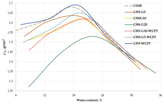 By adding gypsum to the clay, the OMC increases from 17.1% (Cl100) to 22%(Cl80-G20), which indicates that gypsum-modified soil can be compacted to the same degree of compaction at a higher water content (Figure 5), as was reported in [16]. Since the recycled gypsum is predominantly di-hydrate, the “drying-out” effect can be mainly attributed to its water absorption capacity of 2.6 g/L [16]. The addition of gypsum leads to a noticeable decrease in the maximum dry density rd,max, more pronounced with high gypsum content (20%), as mentioned in [16]. This result can not only be explained by the lower specific density of gypsum particles, but also by the increase in the porosity (Table 5). So, the recycled gypsum does not considerably improve soil compatibility. The positive effect on compaction of 5% WCP is more definitive in regard to rd,max—it remains the same as that of compacted clay, while the porosity is significantly reduced, from 0.39 to 0.26. When a combination of 5% recycled gypsum and 5% WCP is applied, the OMC increases, rd,max is close to that of Cl100 and porosity has an intermediate value of 0.32 (Table 6). The increase in gypsum to 10% worsens the results, except for OMC.