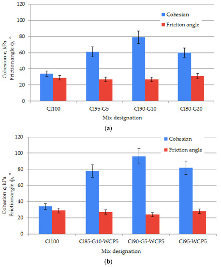 Figure 6 illustrates the main shear resistance parameters—friction angle (ϕ) and cohesion I—which were obtained based on the direct shear test. According to [34], the error does not exceed 10% if the horizontal displacement is less than 7.7% of the specimen size, which is respected in our tests (the maximum displacement is 7%). It was established that the friction angle is impacted less impacted by the modifications—it is in the range of 27–28° for the majority of mixes. Within the mix of the highest gypsum content (Cl85-G15), the friction angle reaches 31°, probably due to the reduction in unbound water content as a result of bassanite hydration.
