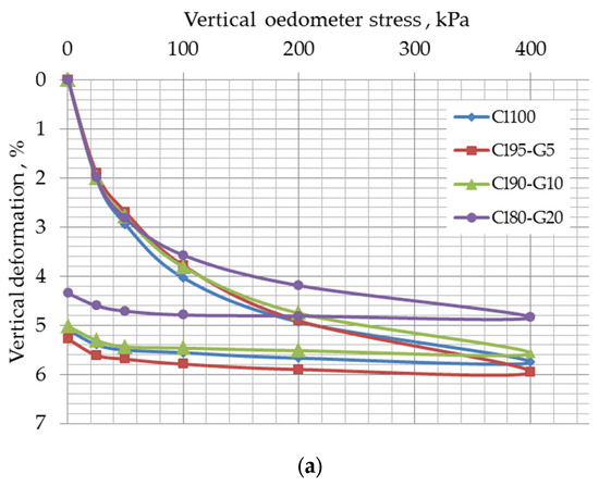 The values of the oedometer modulus (Eoed) as a function of compression loadings for the different soil mixes are presented in Table 5 and Table 6. The oedometer compression stress–vertical deformation relationships are plotted in Figure 7.