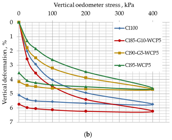 Compression stress–vertical deformation relationships for the different mixes obtained by the oedometer test: (a) modified by recycled gypsum only; (b) modified by WCP with or without recycled gypsum.
