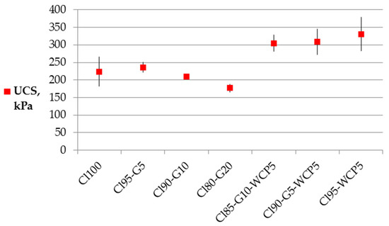 Average values of UCS and their standard deviations for different soil mixes.