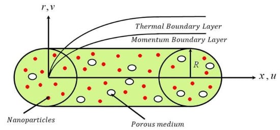 In the present study, we considered an incompressible, steady, 2D (two dimensional) dusty nanofluid motion through a stretching cylinder which is bounded the whole phenomenon graphically by the well-known curvilinear coordinates system () (see Figure 1). The axis of the cylinder is taken along the horizontal direction and the radial axis is taken normal or perpendicular to it. Further, assumed the surface velocity is denoted by , where axis is measured along the surface of the cylinder, is the reference length and is the positive stretching factor (). The impacts of melting and the porous medium were also included in the given model. In addition, and denoted the velocity components along the respective and axes and denoted the temperature of the fluid. Momentum and heat analyses were carried out for both the fluid and dust phases.