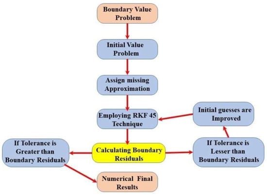 The reduced governing equations and boundary conditions were solved numerically with the help of the RKF-45 method and the shooting scheme. To provide a better understanding of this method, the structural outline for this technique is presented in Figure 2. To obtain the equation, the resultant equations were converted into first-order initial value problems. Consider
