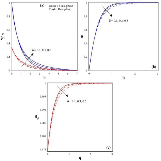 The significant effect of the curvature parameter on the velocity profiles of fluid and dust particles is displayed in Figure 3a. As the magnitude of the curvature parameter increases, the fluid-phase velocity and the dust-phase velocity enhance remarkably. It is evident from Figure 3(a) that the fluid acceleration is the same as the dust velocity, especially in comparison to , and the upsurge of expands the velocity within the boundary layer. Furthermore, when , the problem is limited to a flat surface. As a result of the cylinder, the flow rate inside the boundary layer is larger than that of a level plane. This signifies that the intensifying velocity within the boundary layer is caused by expansion in the cylinder measurement. As predicted, the velocity and momentum increase and the thickness of the boundary layer decreases towards the cylinder’s surface, whereas the reverse effect is observed when distant from it. This is because the opposition supplied in aggregate by viscous forces near the cylinder’s surface is substantially larger than those distant from it. Furthermore, when the curvature parameter increases, the radius of the cylinder decreases, resulting in a reduced resistance to fluid motion and hence an increased fluid velocity. When compared to the liquid state, the inclination of the velocity gradient is significantly quicker in the dust stage. Figure 3b exhibits the variations in the fluid temperature profile, while Figure 3c shows the nature of the dust-phase temperature profile for increased scales of the curvature parameter. As the curvature parameter increases, the radius of the cylinder decreases, resulting in less resistance to fluid motion. Hence, heat distribution decreases in both the fluid and dust phases. These figures unveil that both the fluid- and dust-phase temperature profiles upsurge with an enhancement in the magnitude of curvature parameter.