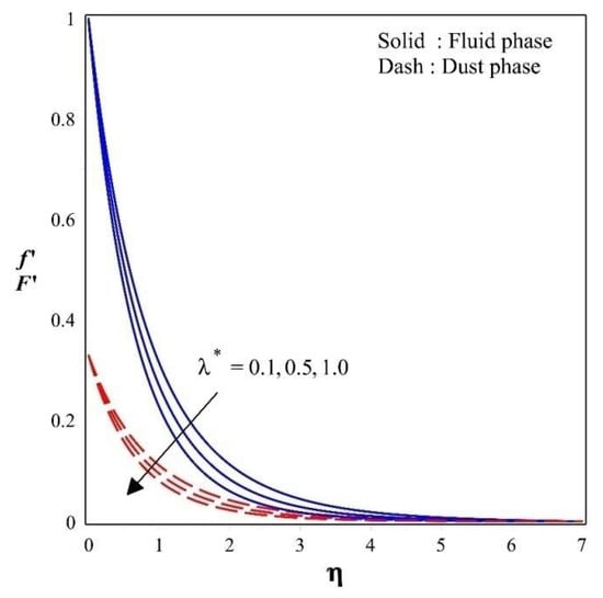 The variations in the fluid- and dust-phase velocity profiles for the diverse magnitudes of porosity parameter are indicated in Figure 4. The fluid-and dust-phase velocity gradient drops gradually with an augmentation in the value of the porosity parameter. An upsurge in the value of the porosity parameter is the major cause of lower permeability, which results in a reduction in velocity. From a physical point of view, the permeability of a porous medium depends on both the porosity and particle size. A rise in the porosity parameter causes the porous medium to restrict the flow of liquid, decelerating its movement. As a result, the thickness of the boundary layer is diminished and thereby the velocity profiles of both phases drop rapidly.