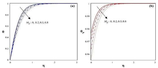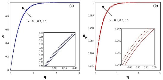 Figure 5a indicates the impact of the Eckert number on the fluid-phase temperature profile, while Figure 5b shows the impact for the dust-phase temperature profile. In both the figures, one can perceive that the temperature profile increases with a rise in the Eckert number . Increments in the Eckert number strengthen the intermolecular movement and kinetic energy in liquids. As a result, the thermal variation, including both stages and the associated boundary layer, is enhanced by this intermolecular tension.