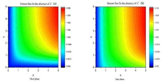 Figure 9a,b and Figure 10a,b show the streamline patterns with the impact of the porosity parameter. In the absence of the porosity parameter, Figure 9a indicates the streamline variations for the fluid phase, whereas the streamline pattern in the presence of the porosity parameter for the dust phase is exhibited in Figure 9b. Figure 10a,b show the streamline plots drawn to show the impact of the porosity parameter for both the fluid and dust phases, respectively.
