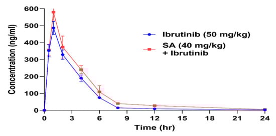 SA is beneficial regarding oxidative stress [], hepatoprotective [,], cardioprotective [,,,], gastroprotective [], nephroprotective [], inflammation [], hyperglycaemia [], neurodegeneration [], and anxiety [,]. SA is widely consumed as a dietary supplement due to its chemopreventive potential. The chemopreventive oral dose of SA is 40 mg/kg b.w [,,,,,,]. This is the first report on the IBR pharmacokinetic interaction with dietary supplementation of SA 40 mg/kg in rats. IBR is absorbed following oral administration and takes 1 to 2 h to reach the maximum plasma concentration (Tmax) []. IBR exposure increases in patients consuming 420 mg daily; the area under the curve (AUC) was 680.52 ng h/mL [,]. Oral administration of IBR is rapidly absorbed in the intestine, with Cmax, Tmax, and AUC values of 35 ng/mL, 1–2 h, and 953 mg h/mL, respectively []. IBR binds to plasma proteins similarly to all other kinase inhibitors. In vitro, IBR plasma protein binding is 97.30 percent reversible, without concentration dependence (50 to 1000 ng/mL; at a steady state, the volume of the distribution (Vd, ss/F) was around 10,000 L) [].
