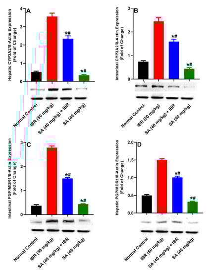 SA was found to have an inhibitory effect on Pgp/MDR1 protein expression (Figure 2). As compared to normal control animals, PGP/MDR1 protein expression was considerably reduced in the intestine and liver of rats pretreated with SA and significantly (p < 0.05) increased in the intestines and livers of IBR-treated rats (661.79% and 202.88%, respectively). As compared to IBR alone, the SA-pretreated rats demonstrated a considerable suppression of IBR-induced PGP/MDR1 protein (46.11% and 32.82%, respectively). Pretreatment with SA (40 mg/kg) alone reduced hepatic and intestinal CYP3A2 protein expression by 18.58% and 35.48%, respectively, compared to controls.