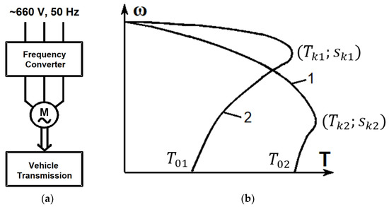 Functional diagram of the traction drive (a) and mechanical characteristics of electric motors (b): 1—traction motor, 2—motor for frequency control.