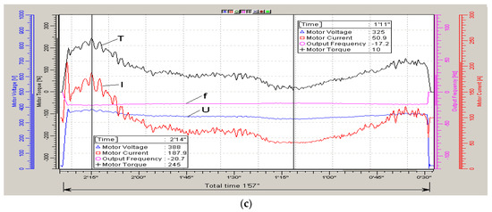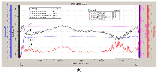 In this case, the stator current (I), frequency (f) and stator voltage amplitude (U) of the electric motor were recorded. The main parameter was the U/f ratio (determining the main magnetic flux in the motor and further denoted by the conventional units “Fl”) for three speeds: low (0.5 m/s), medium (1.5 m/s) and high (2.5 m/s).