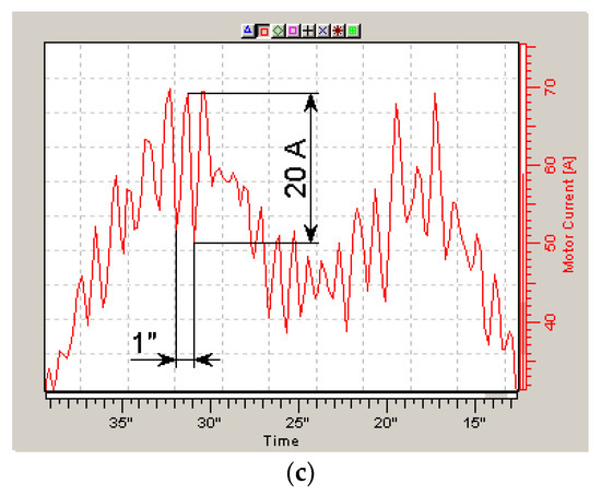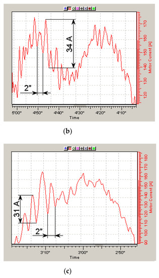 By changing the parameters of the stator voltage, it was possible to reduce the average effective values of the stator currents by 20%, increasing the carrying capacity by the same 20% (Figure 3a,b) when driving at an average speed. At the same time, it turned out that with an increase in the main magnetic flux on track 1, the stator currents decrease at high loads and increase at low loads when driving along track 2 (Figure 4) with smaller slopes. Similar results were obtained in a number of studies, such as, for example, in article [1], published in 2021.