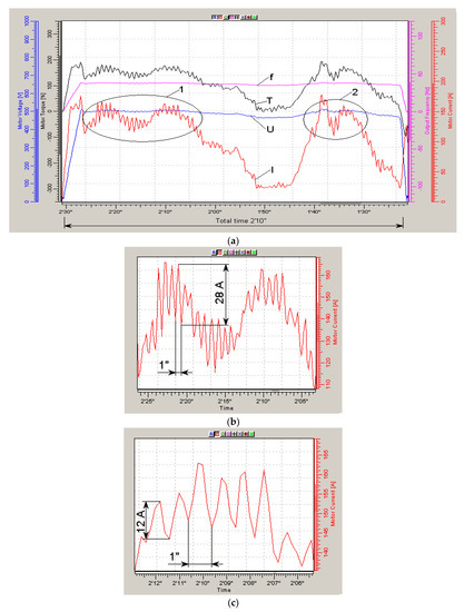 Diagrams of movement at high speed along track 4 with parameters U = 230 V, f = 17 Hz and U/f = 13.2 Fl (a) and extended sections 1 (b) and 2 (c) of the current diagrams.