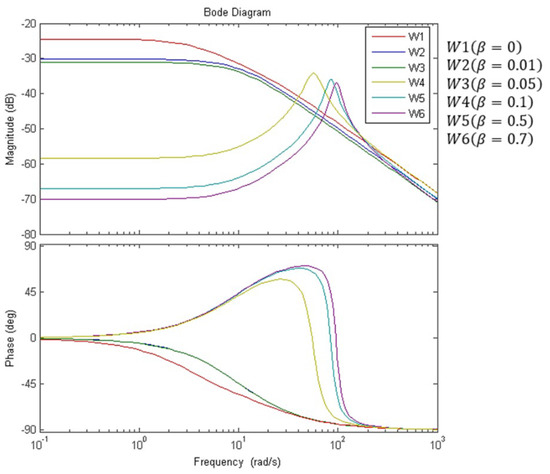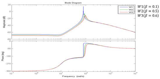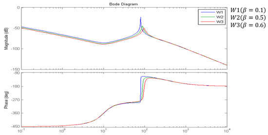 The phase shift (−180°) occurs approximately at a frequency of about 100 rad/s, and the contour coefficient necessary for the harmonic balance value “1” has a frequency characteristic with a slip of 0.6 (curve W3 on Figure 11), hence the variations in frequency characteristics and slip: