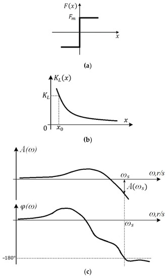 Nonlinear element function (a) and linearization coefficient function (b), nonlinear system frequency characteristics (c).