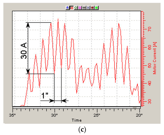 The timing diagrams were taken by the NCDrive program, while the effective values of the stator currents (red diagram) were obtained by direct measurements and the torque diagram (black diagram) was obtained by the calculation method in the Vacon converter. Therefore, the analysis will be carried out mainly according to the diagrams of the effective values of the stator current of the traction motor (I).