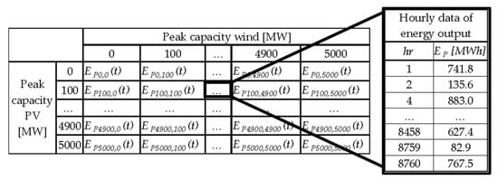 A large set of potential combinations of wind and PV generators were modelled to obtain optimum cost values. Various configurations of each subsystem were assessed, each comprising of multiples of the “base” system spanning from 0 to 5000 MWe in steps of 100 MWe. Hourly data energy was computed for each of the configurations by adding up the hourly data of the “base” systems. Figure 2 illustrates the method of computing each generation system.