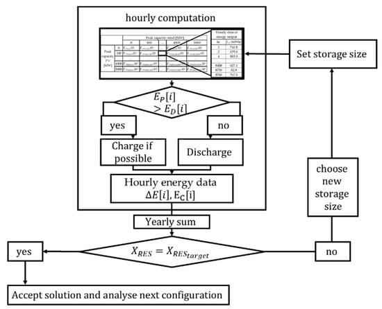 For a given value of the target renewable share the model iteratively searches for the minimum amount of storage necessary to fulfil the demand to reach the chosen value of for each combination of wind and PV generators. Starting from an arbitrary storage size, the storage size is multiplied by a factor of ten until the target is surpassed. Following this initialization, progressive bisection is used to find the storage size that fulfils the with an accuracy of Figure 3 illustrates schematically the logic used to identify the size of the storage needed to satisfy a given value of for each of the configurations.