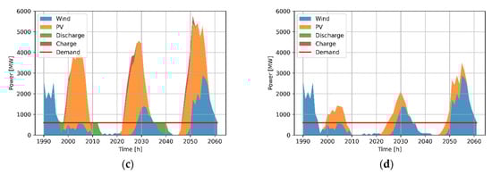 Stacked power values for three typical days of generation and consumption in March for the configurations with minimum storage requirements for (a) , (b) , (c) , and (d) .