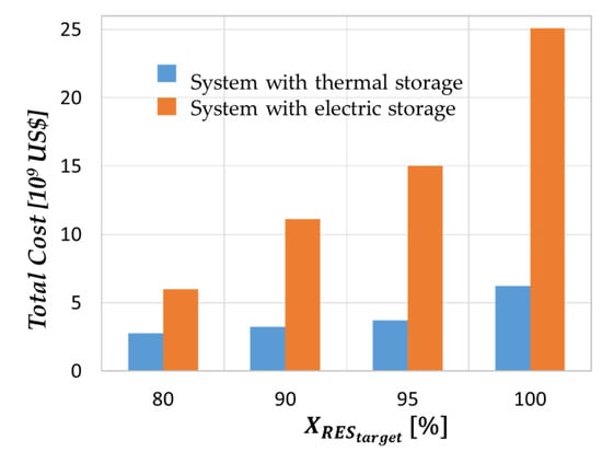 For each configuration of wind, PV and storage (thermal and electric battery), the system was priced using the assumptions of Table 5 to find the lowest initial investment cost and the results are shown in Table 7 and Figure 5. It can be seen that the systems using thermal storage are significantly cheaper than that of electric battery storage. An interesting observation is that optimizing for the lowest capital investment does not favor the systems with the smallest storage, see Section 3.1. Furthermore, due to the low thermal storage cost, the excess energy is much lower for the configurations with thermal storage systems. For the cost for the system utilizing thermal storage is less than half of that of the system using electric battery storage. The advantage of thermal storage over electric battery storage increases with the . For , the ratio between the total cost for a system with electrical and thermal storage is about four.