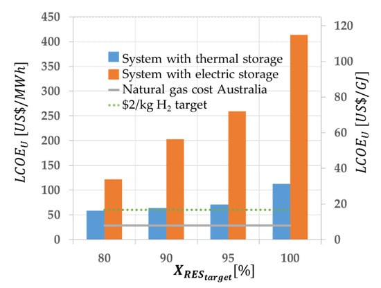 The LCOE as a function of the renewable share targets defined in Equation (2) for the case in which the excess electrical energy is utilized or exported (to the grid). The LCOE values are compared with a reference natural gas cost in Australia in 2021 of USD 8/GJ [40] and the USD 2/kg target for hydrogen production [41].