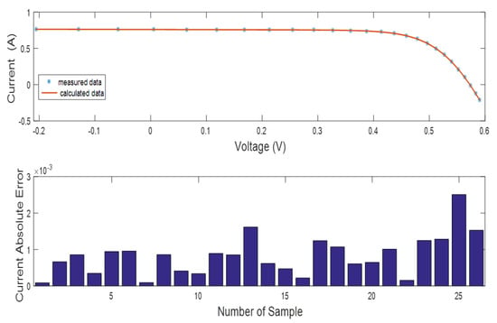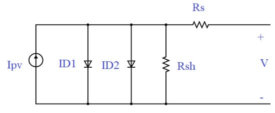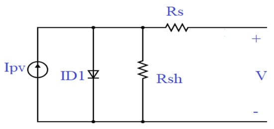 The estimation of theses parameters can be solved via two categories: metaheuristic techniques, and iterative methods. In [], a mathematical model for the SD model is discussed. Improvement of power generated from solar cells is included in []. The I–V characteristics are determined as nonlinear characteristics based on three points []. Iterative solutions have been applied to identify the PV variables in [,,,], such as the Lambert W function [], maximum-likelihood-based Newton–Raphson [], linear least squares [], and Gauss–Seidel methods []. Furthermore, several works neglect some variables, or make assumptions to decrease the number of parameters required to be estimated [,,].