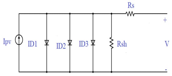 The solar cells have several models according to the number of diodes connected in the model, e.g., single-diode (SD), double-diode (DD), and three-diode (TD) models, and their modifications [,]. The identification of parasitic variables from the solar cell is also important to obtain the best performance []. The number of variables is dependent on the model: the single-diode model and its modification have 5 and 6 parameters, respectively; the double-diode model and its modification have 7 and 8 parameters, respectively; the triple-diode model and its modification have 9 and 10 parameters, respectively [,].
