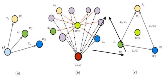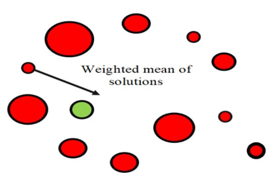 For any set of vectors, the mean represents the average of their positions , and is weighted by the vector’s fitness (. The weighted mean for a set of solutions is depicted in Figure 4, where the solutions (vectors) of bigger weights show better efficiency in computing the solutions’ weighted mean. Equation (9) is implemented to compute the weighted mean ():
