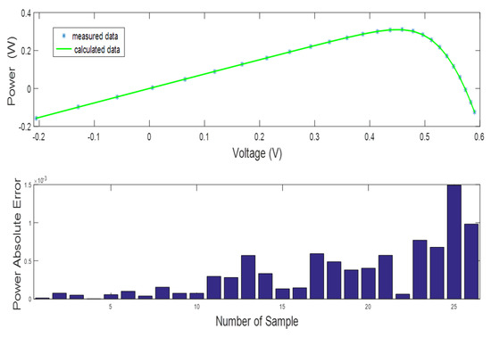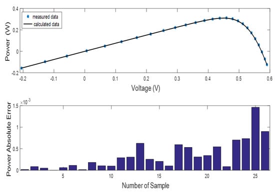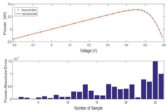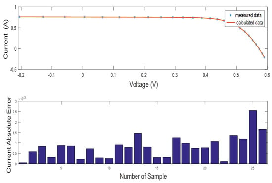The results of the decision variables for the SDMSC assessed by the proposed INFO method and the other relative methods at the best RMSE are delineated in Table 3. The best technique, achieving the optimal RMSE value of 0.000986021877891538, is the INFO technique. The order of techniques based on the best value for RMSE is as follows: (1) INFO; (2) RUN; (3) MFO; (4) GWO; (5) HHO; (6) TSA; (7) SCA; (8) ChOA. The characteristics of the SDMSC based on the optimal decision variable estimated from the INFO algorithm are used to simulate the P–V and I–V curves, as shown in Figure 7 and Figure 8, respectively. Moreover, these figures describe the absolute error for power and current. According to the results in these figures, the power achieves absolute error equal to 1.97225076923463E-06 and the current achieves absolute error equal to 0.0000877042896620939. Furthermore, high similarity between the calculated and measured data is achieved by the INFO algorithm, meaning that the INFO algorithm achieves high performance and is accurate in identifying the decision parameters of the SDMSC.