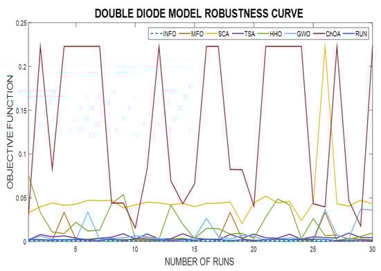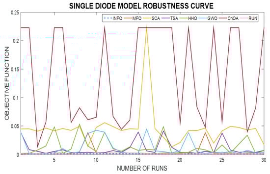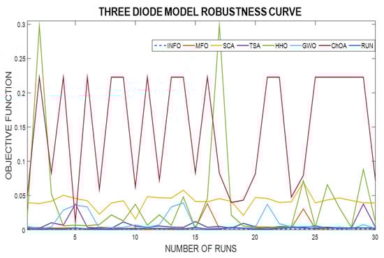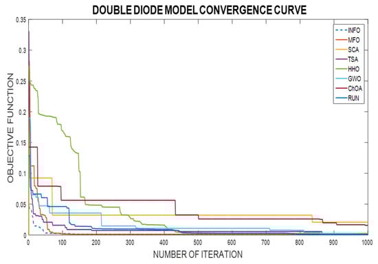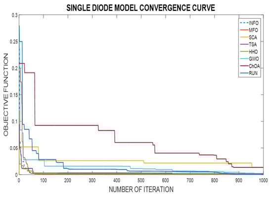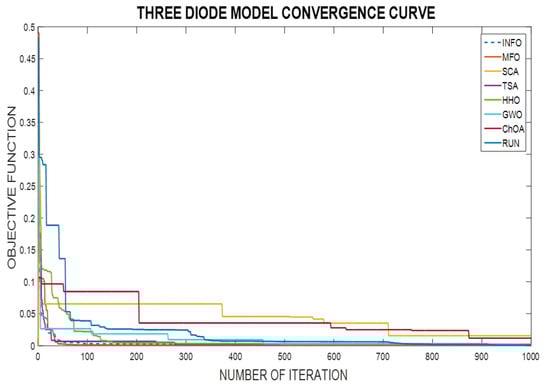 This section demonstrates the extracted parameters for the TDMSC, DDMSC, and SDMSC using the INFO algorithm. The proposed INFO method is compared with other methods, such as Harris hawk optimization (HHO) [], tunicate swarm algorithm (TSA) [], sine–cosine algorithm (SCA) [], moth–flame optimizer (MFO) [], grey wolf optimization (GWO) algorithm [], chimp optimization algorithm (ChOA) [], and Runge–Kutta optimization []. The R.T.C France module is used as case study for comparison between all methods. The variable settings for all techniques are given in Table 2.