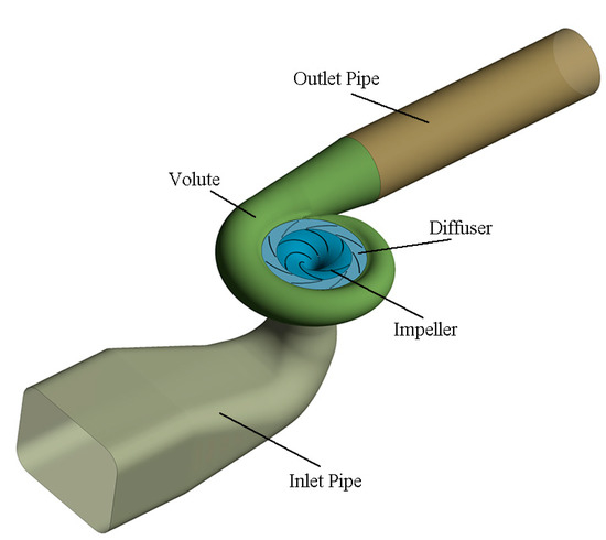 The 3D modeling of the computational domain including the inlet and outlet pipe was completed by UG NX software, as shown in Figure 1. The volute outlet was located at the side and the cross-section was circular. The number of impeller blades was Zim = 6 and the number of diffuser vanes was Zdi = 8. The remaining design specifics are shown in Table 2.